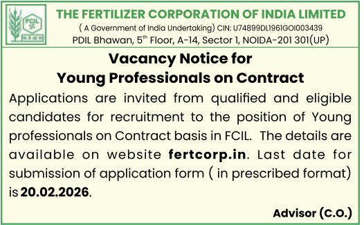 Fertilizer Corporation of India Limited (FCIL), a government-owned PSU under the Ministry of Chemicals & Fertilizers, has announced recruitment for Young Professionals in Finance, Company Secretary, Accounts, and other disciplines. The appointments will be on a contract basis at multiple FCIL project sites across India including Noida, Sindri, Ramagundam, Gorakhpur, and Korba. Eligible candidates must send their applications through email in the prescribed format before 20 February 2026.